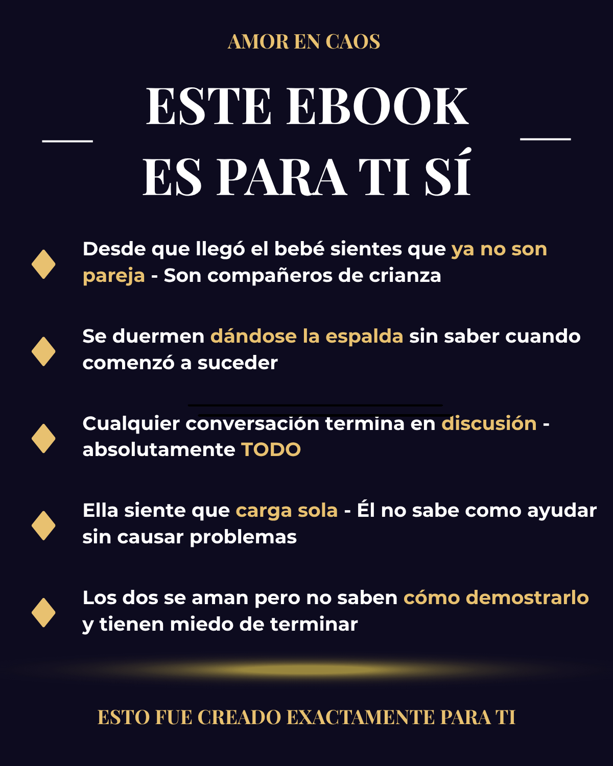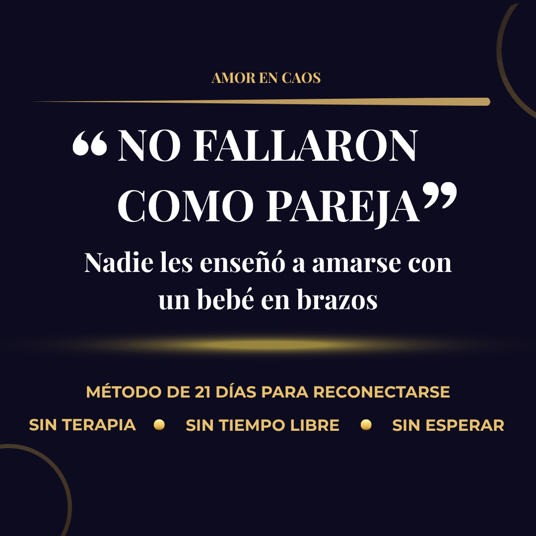 No. La terapia es un proceso largo, caro y que requiere que los dos vayan al mismo ritmo. Amor en Caos es un método directo y práctico que puedes aplicar hoy mismo, solo o en pareja, sin esperar turno y sin pagar $200 por sesión. No reemplaza la terapia en casos graves, pero para la mayoría de parejas en crisis postparto es lo que necesitan primero.