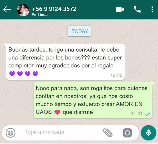 El método completo Amor en Caos + 5 bonos: Guía de Supervivencia para Él, Cómo Hablar con tu Pareja Sobre este Ebook, SOS Intimidad, Kit de Emergencia y Mapa de los 30 Días. Todo en formato digital con acceso inmediato. Valuado en $39.950 CLP — hoy incluido en tu compra sin costo adicional.
